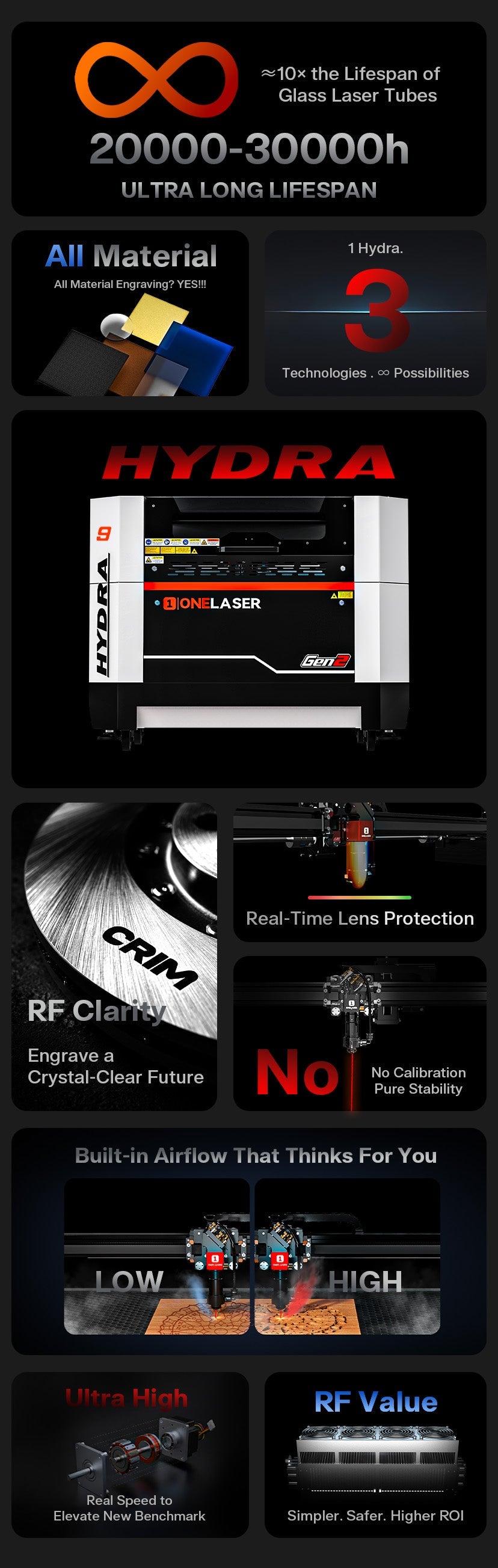 ONELASER Hydra 16 Gen2 – RF Laser Cabinet System, High-Speed Engraving, Smart Air Assist, Optional Fiber & 150W CO₂ Upgrades